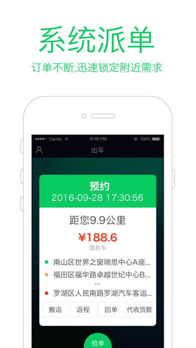 3.一键接单快捷操作:司机通过一键接单,省去复杂的交易流程,使接单过程简单化,响应速度更快。